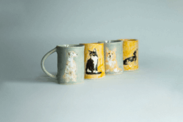 une collection de 4 tasses en grès, peintes à l'émail, ainsi qu'un nouveau poster en risographie 5 couleurs, édition limitée à 100 exemplaires.
